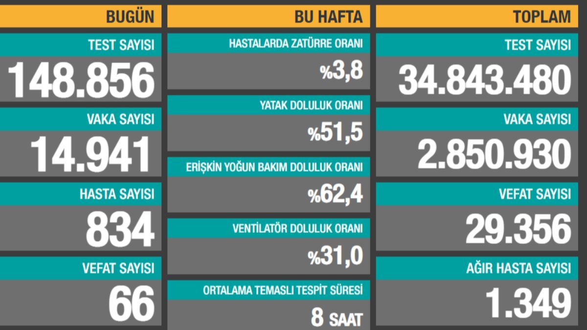 Bugünkü tabloya göre, son 24 saat içerisinde 148 bin 856 kişiye koronavirüs testi yapıldı. Böylelikle yapılan toplam test sayısı 34 milyon 843 bin 480'e ulaştı.