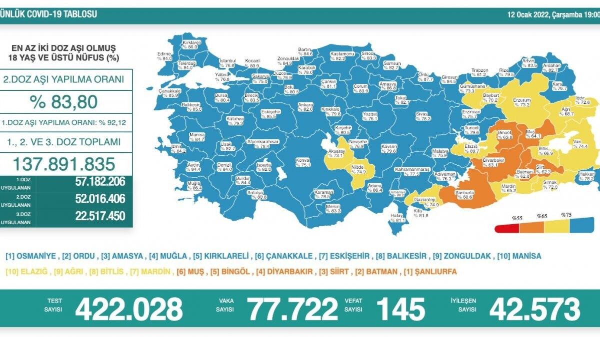 Buna göre; Türkiye'de son 24 saatte 422 bin 28 Kovid-19 testi yapıldı, 77 bin 722 kişinin testi pozitif çıkarken, 145 kişi ise hayatını kaybetti.