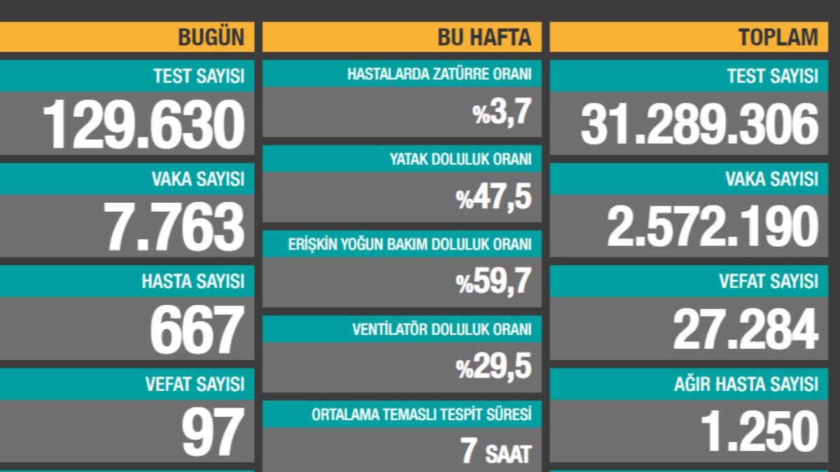 Bugünkü tabloya göre, son 24 saat içerisinde 129 bin 630 kişiye koronavirüs testi yapıldı. Böylelikle yapılan toplam test sayısı 31 milyon 289 bin 306'ya ulaştı.