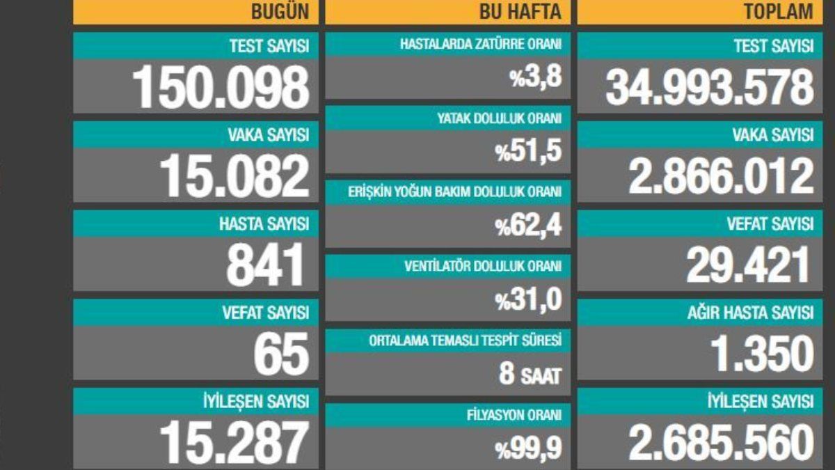 Bugünkü tabloya göre, son 24 saat içerisinde 150 bin 98 kişiye koronavirüs testi yapıldı.