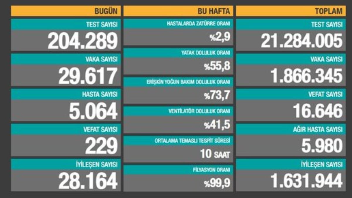 Paylaşılan tabloya göre bugün, 29 bin 617 kişi daha koronavirüse yakalandı.