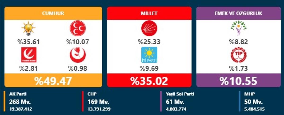 Buna göre, AK Parti, girdiği yedinci genel seçimden de birinci parti olarak çıktı. Bu durumda "Cumhur ittifakı" parlamentoda çoğunluğu elde etti.