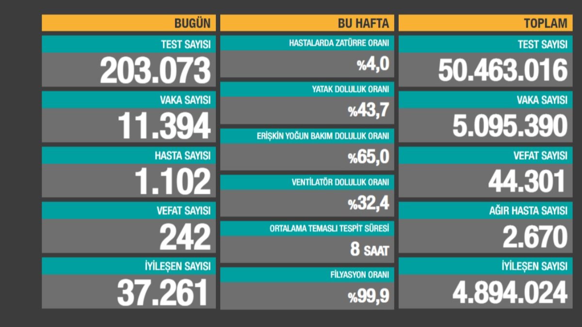 Bakanlığın paylaştığı tabloya göre bugün yapılan testler sonucu 11 bin 394 yeni vaka tespit edildi.