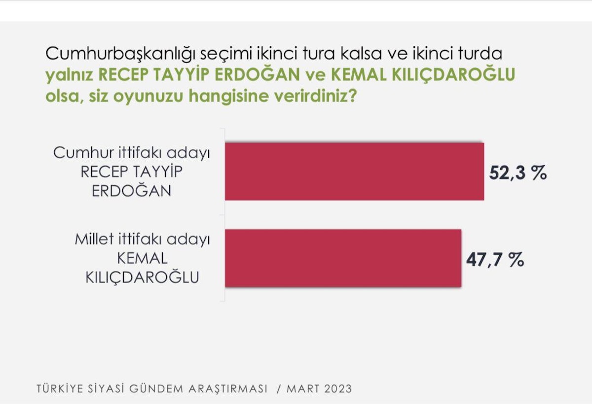 Mart ayında yapılan ankette katılımcılar, yüzde 52,3 ile Cumhur İttifakı'nın adayı Recep Tayyip Erdoğan'ı seçti.