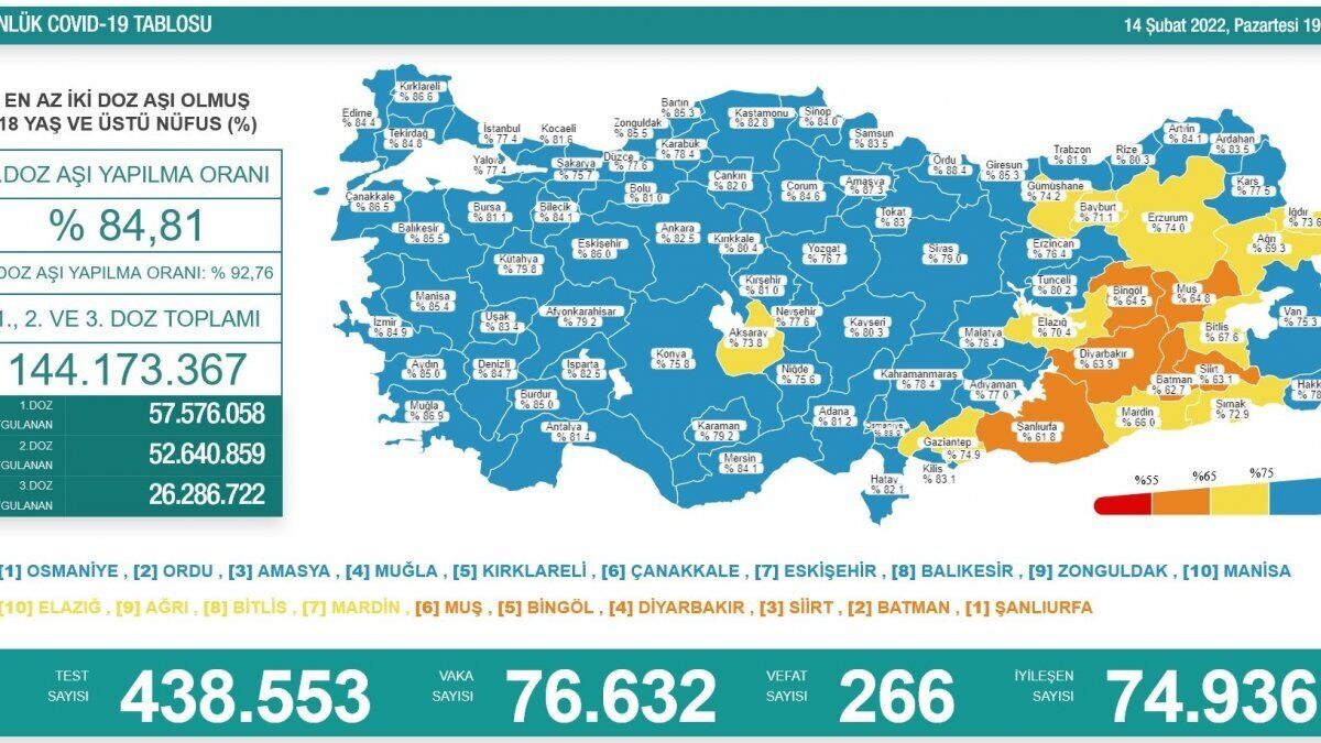 Buna göre; Türkiye'de son 24 saatte 438 bin 553 Kovid-19 testi yapıldı, 76 bin 632 kişinin testi pozitif çıkarken, 266 kişi ise hayatını kaybetti.
