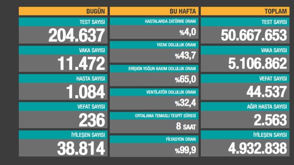 Bakanlığın paylaştığı tabloya göre bugün yapılan testler sonucu 11 bin 472 yeni vaka tespit edildi.