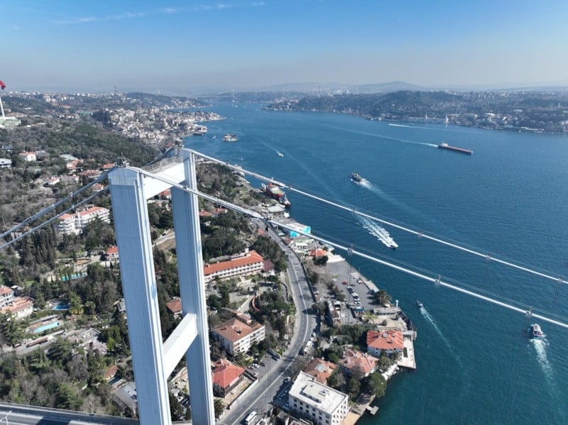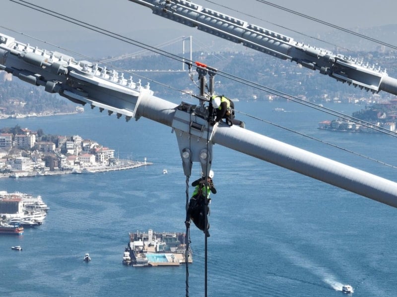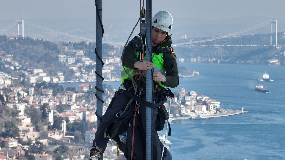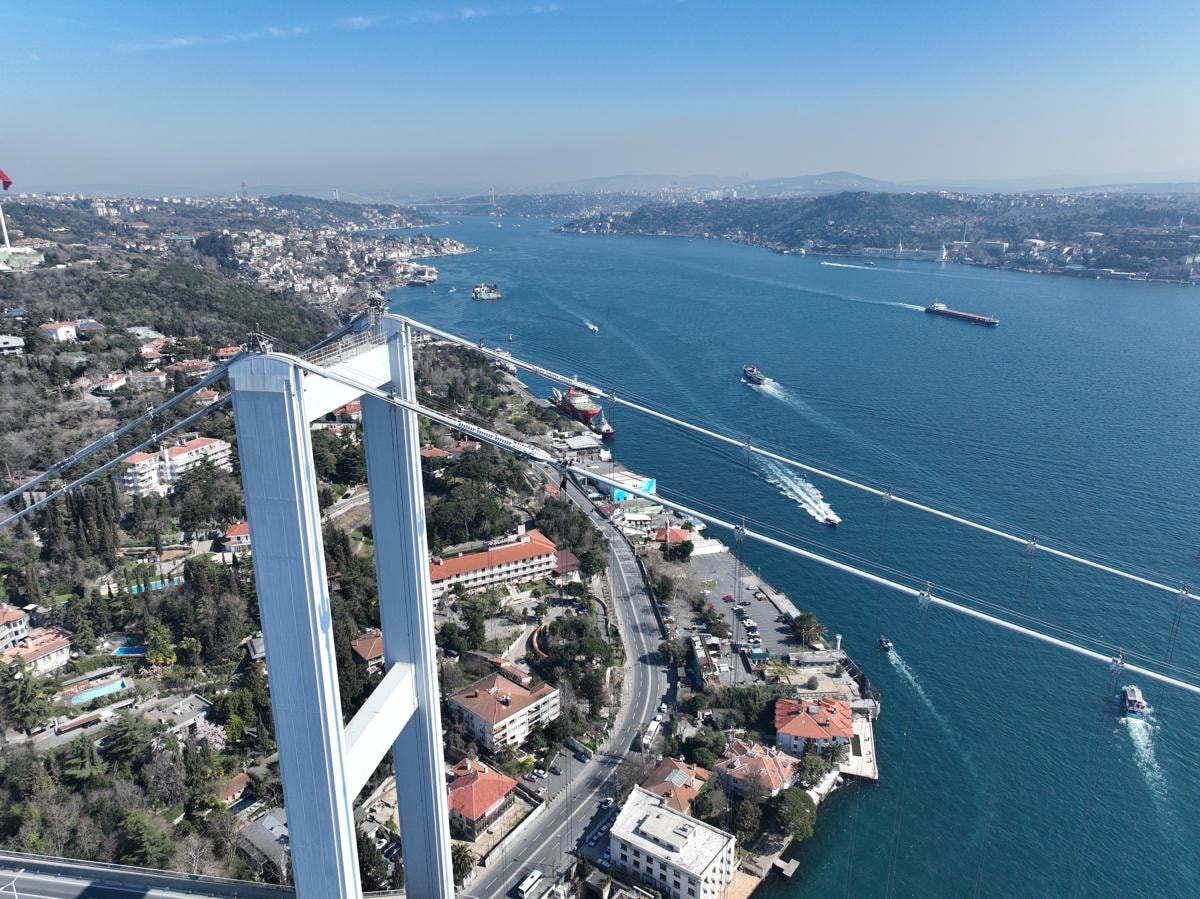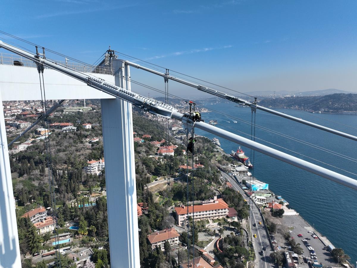 Deniz seviyesinden en yüksek noktası 165 metre olan köprünün halatları üzerindeki işçilerin zorlu çalışması havadan çekilen görüntülere yansıdı.