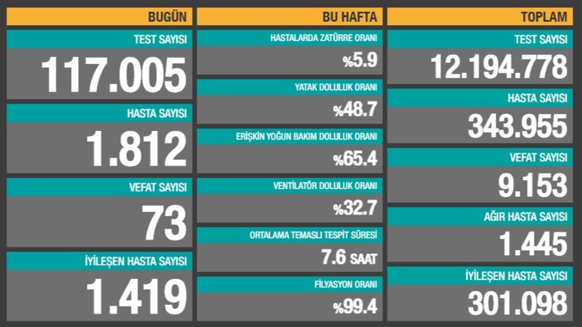 Bakanlığın yayınladığı tabloya göre, bugün yapılan testler sonucu 1812 kişi daha korona hastalığına yakalandı.