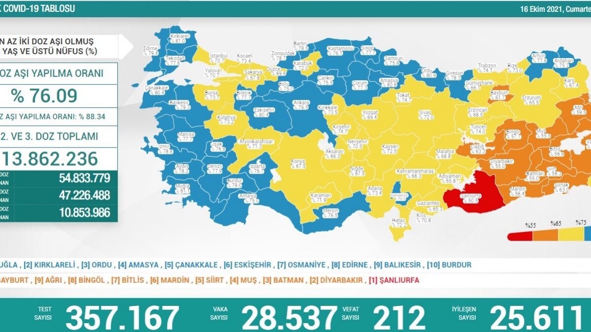 Buna göre; Türkiye'de son 24 saatte 357 bin 167 Kovid-19 testi yapıldı, 28 bin 537 kişinin testi pozitif çıktı, 212 kişi hayatını kaybetti.