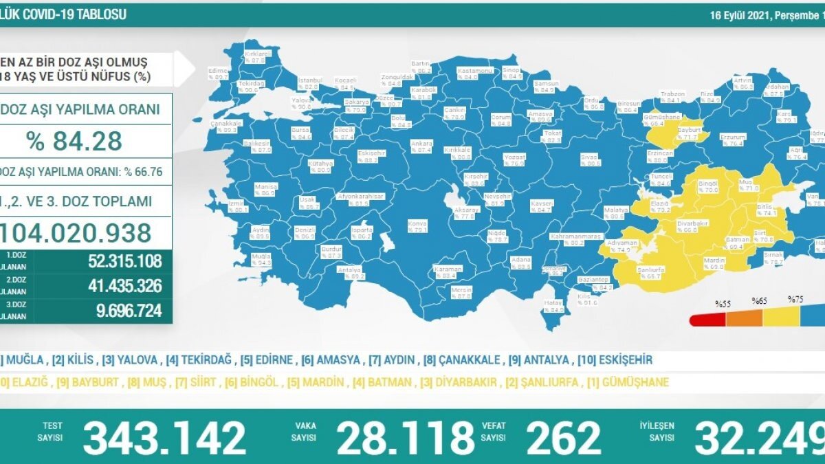 Buna göre; Türkiye'de son 24 saatte 343 bin 142 Kovid-19 testi yapıldı, 28 bin 118 kişinin testi pozitif çıktı, 262 kişi hayatını kaybetti.