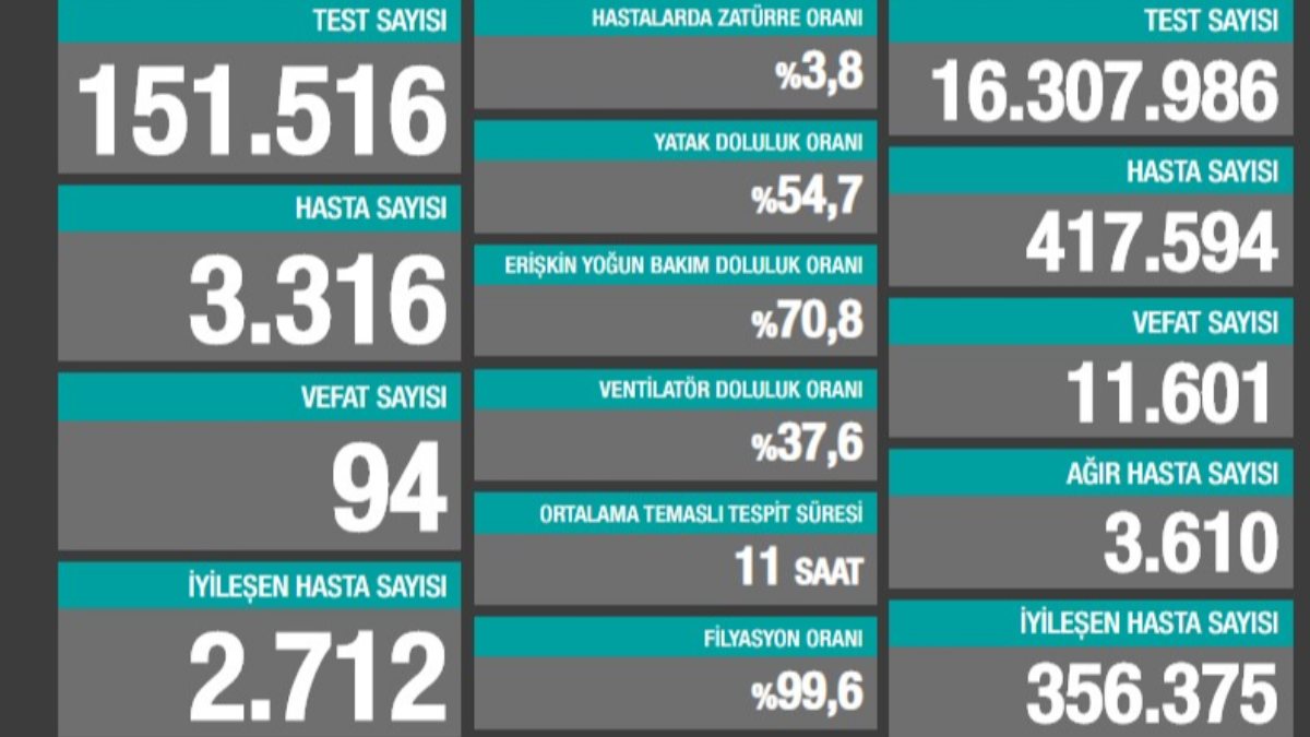 Sağlık Bakanı Fahrettin Koca'nın açıkladığı tabloya göre, bugün hastalığa yakalananların sayısı 3 bin 316 oldu.