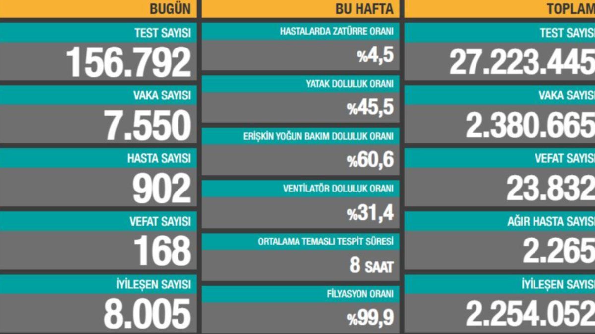 Paylaşılan tabloya göre bugün yapılan testler sonucu 7 bin 550 yeni vaka tespit edildi. 902 kişinin ise semptom gösteren hasta oldukları belirlendi.