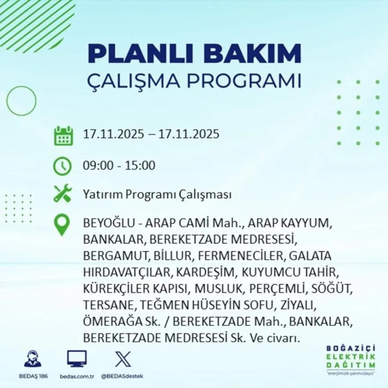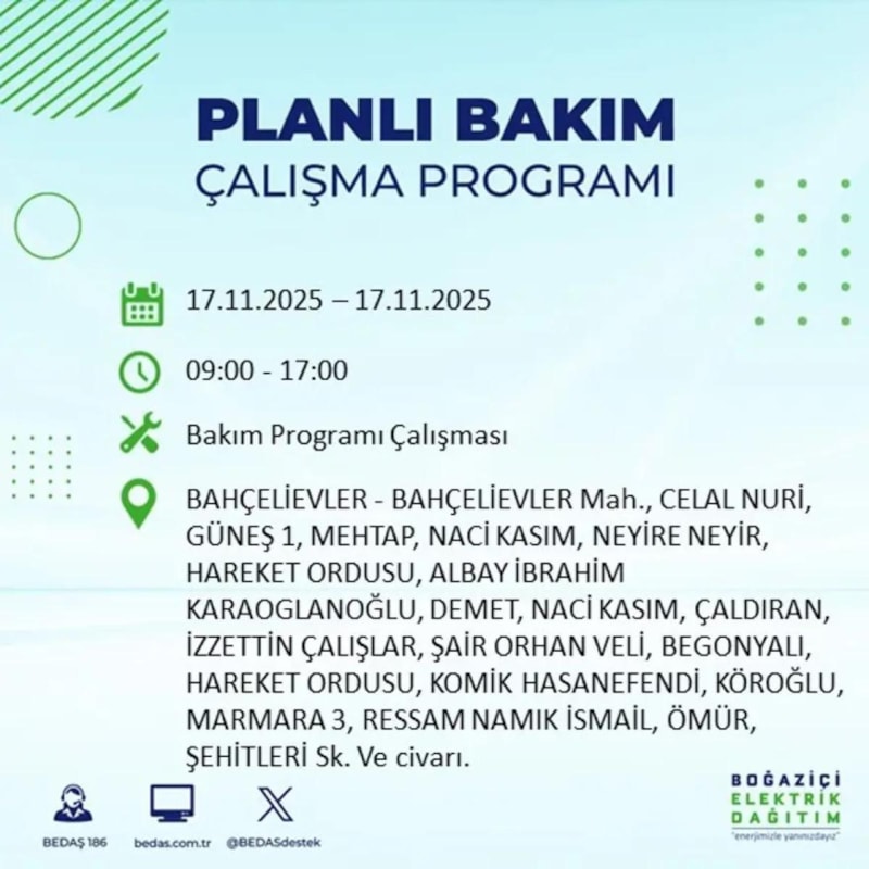 17 Kasım 2025 Pazartesi günü, İstanbul'un bazı bölgelerinde elektrik kesintisi yaşanacak.