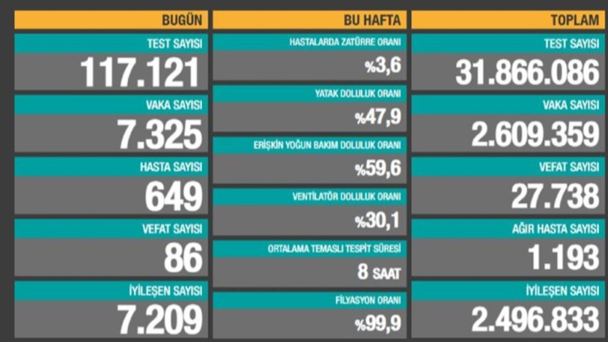 Güncel verilere göre Türkiye'de son 24 saatte 117 bin 121 Kovid-19 testi yapıldı, 7 bin 325 kişinin testi pozitif çıktı.