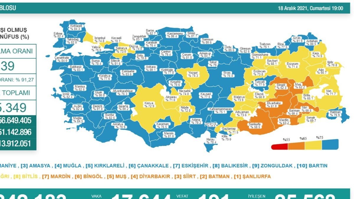 Buna göre; Türkiye'de son 24 saatte 342 bin 183 Kovid-19 testi yapıldı, 17 bin 644 kişinin testi pozitif çıkarken, 191 kişi ise hayatını kaybetti.