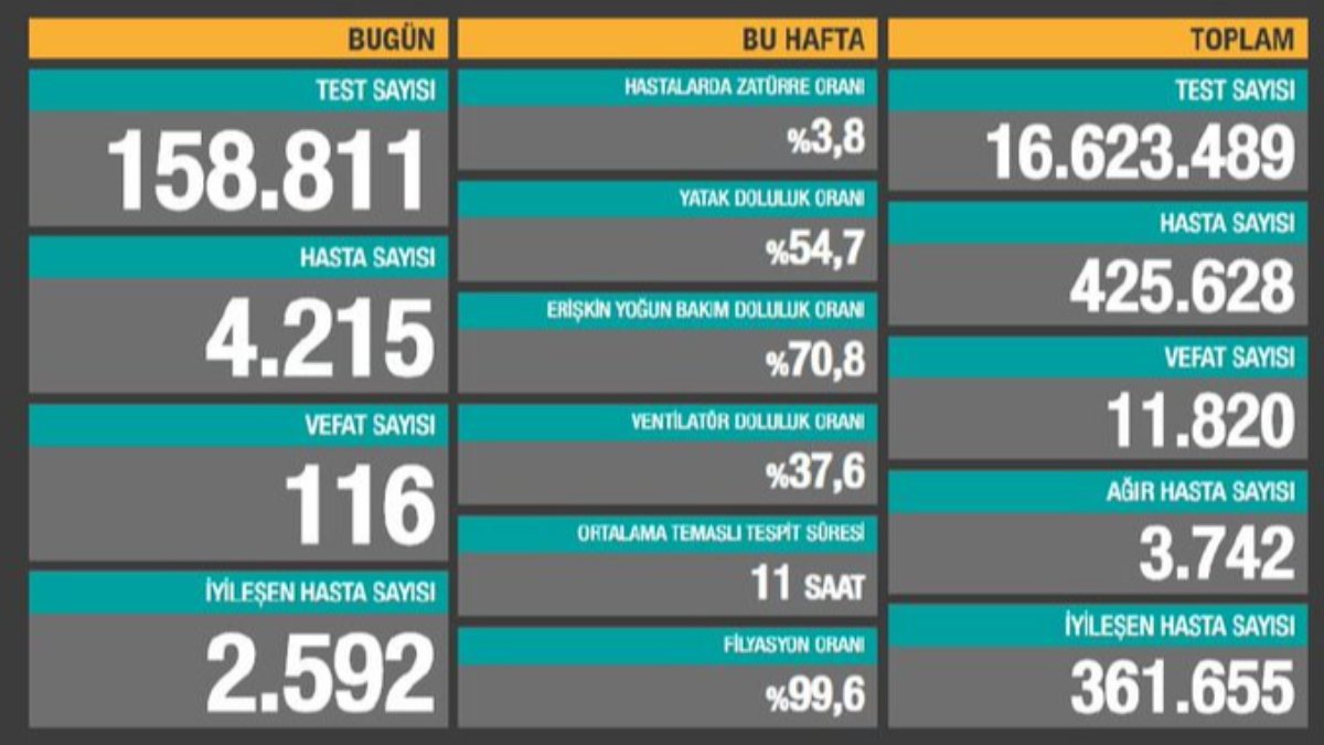 Bakan Fahrettin Koca paylaşımını, "Bugün tespit edilen 4.215 hasta var. Ağır hasta sayısındaki artış devam ediyor. Virüsün yayılımı bizi zorunlu tedbirler almaya mecbur bırakıyor. Hastalığın yayılımını durdurmak için birlikte hareket etmeliyiz. Tedbirlere birlikte uyarak mücadele güç verin." notuyla yaptı.