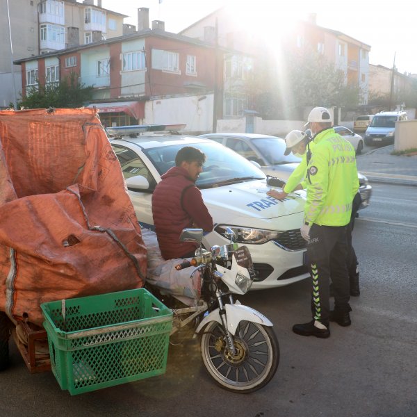 Sivas’ta polis ekipleri, Yenimahalle Menderes Caddesi üzerinde yaptığı denetimlerde motosikletle kağıt toplayan bir genci durdurdu.