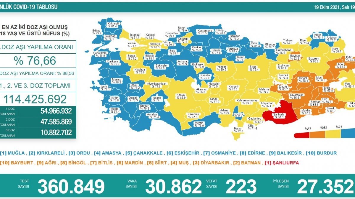 Buna göre; Türkiye'de son 24 saatte 360 bin 849 Kovid-19 testi yapıldı, 30 bin 862 kişinin testi pozitif çıktı, 223 kişi hayatını kaybetti.