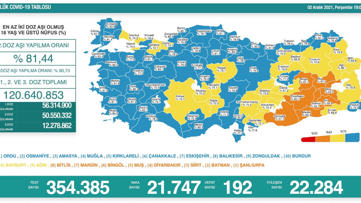 Buna göre; Türkiye'de son 24 saatte 354 bin 385 Kovid-19 testi yapıldı, 21 bin 747 kişinin testi pozitif çıkarken, 192 kişi ise hayatını kaybetti.