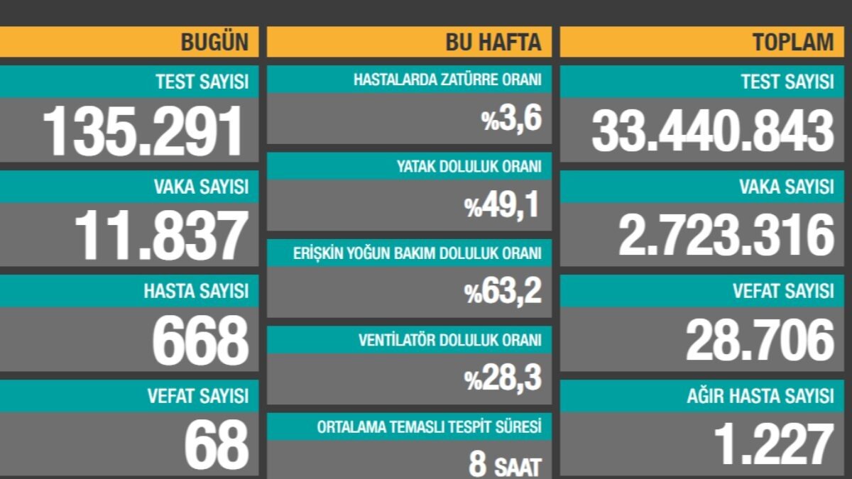 68 vatandaşımızın salgına yenik düşmesiyle toplam can kaybı 28 bin 706'ya yükseldi.