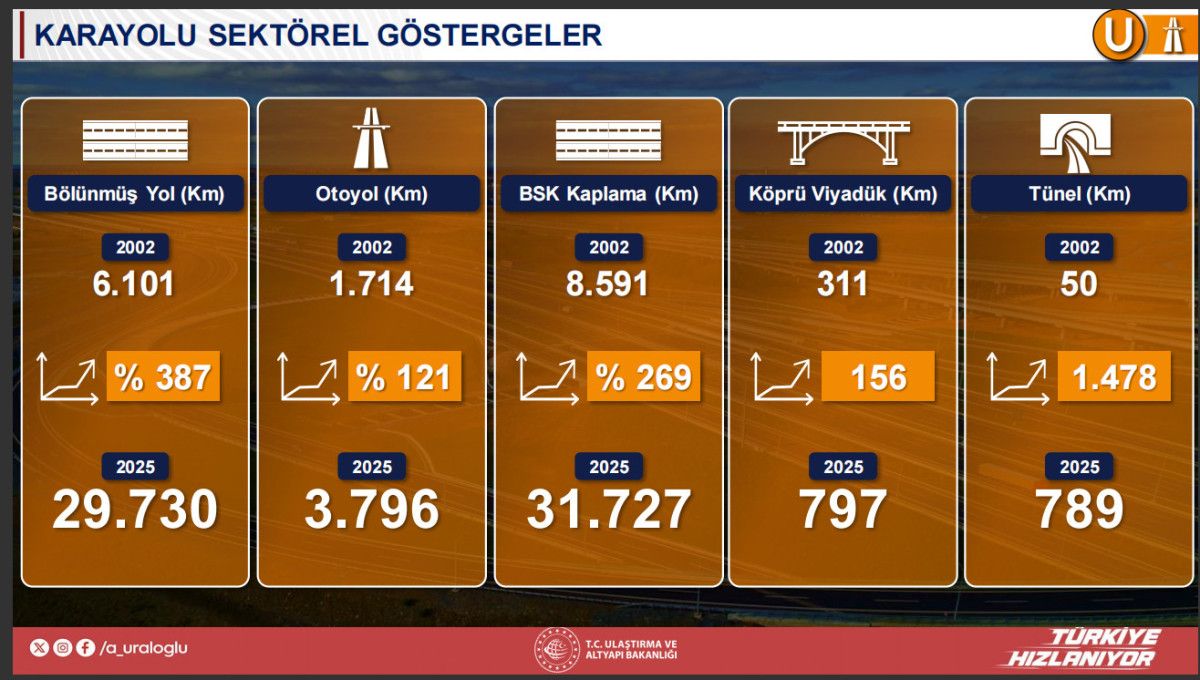 Türkiye'de 2002'de bin 714 kilometre olan otoyol uzunluğu takvimler 2025'i gösterdiğinde 3 bin 796 kilometreye çıkıyor. Bu tam tamına yüzde 121 artış anlamına geliyor.