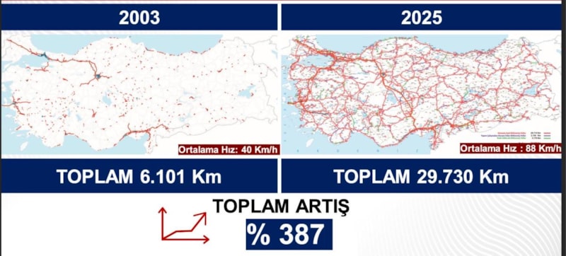 20 yılı aşan ulaşım alanındaki büyük atılım sayesinde 2003'te 6 bin 101 kilometrelik bölünmüş yol uzunluğu tarih 2025'e gelince tam 29 bin 730 kilometreye ulaşarak yüzde 387 artış gösterdi.