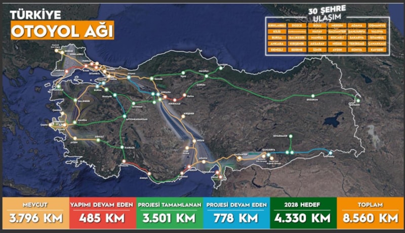 Türkiye'nin en doğusu ile batısını, en kuzeyi ile güneyini birleştiren otoyollar da dikkat çekiyor.