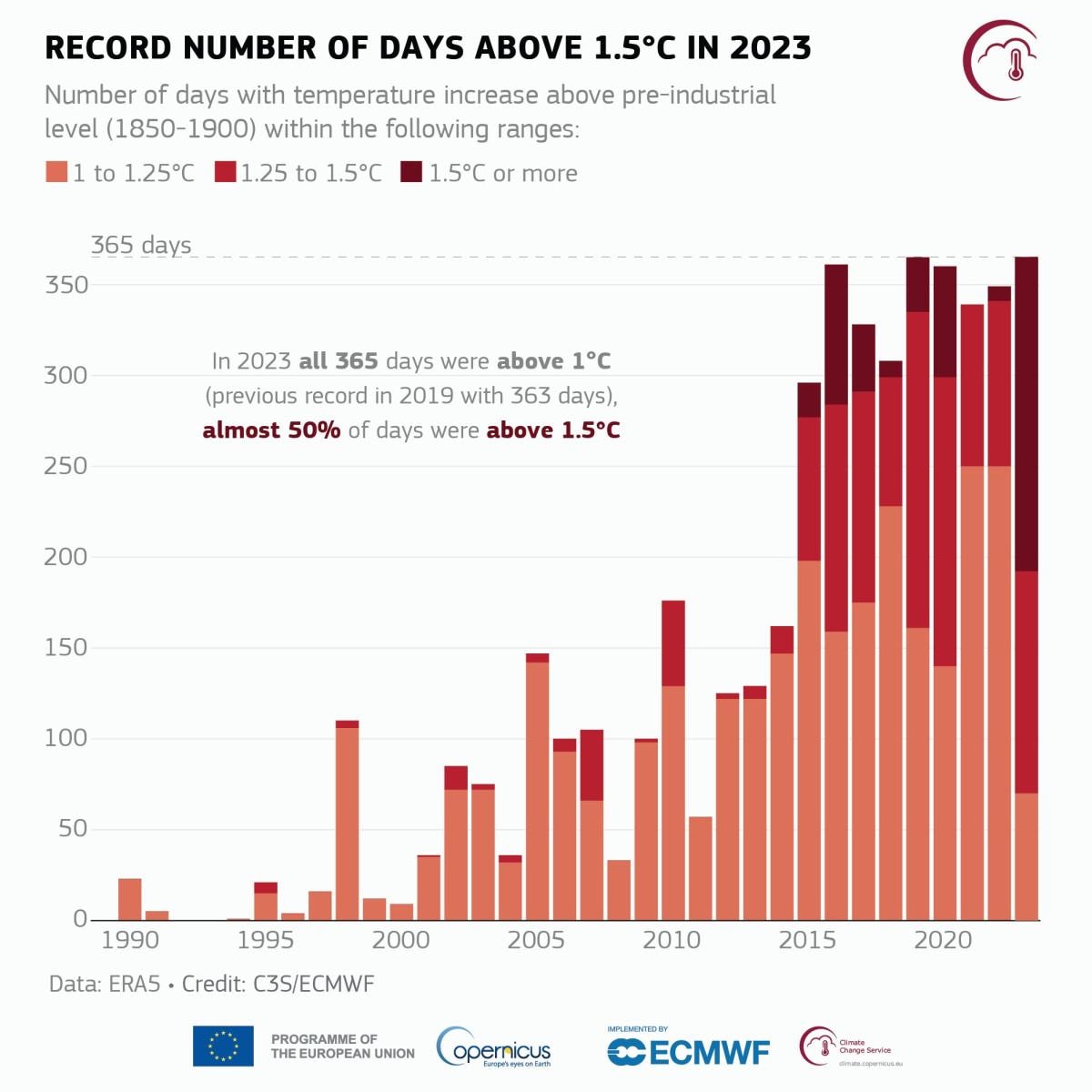 2023 yılının 1850-1900 sanayi öncesi döneme kıyasla ortalama küresel sıcaklığın her gün 1 dereceyi aştığı tek yıl olduğu ifade edilen raporda, 2023 yılını neredeyse yarısının 1850-1900 sanayi öncesi döneme kıyasla 1,5 derece daha sıcak olduğu ve Kasım 2023'te iki gün sıcaklık artışının ilk kez sanayi öncesi dönem ortalamasına göre 2 dereceyi aştığı belirtildi.