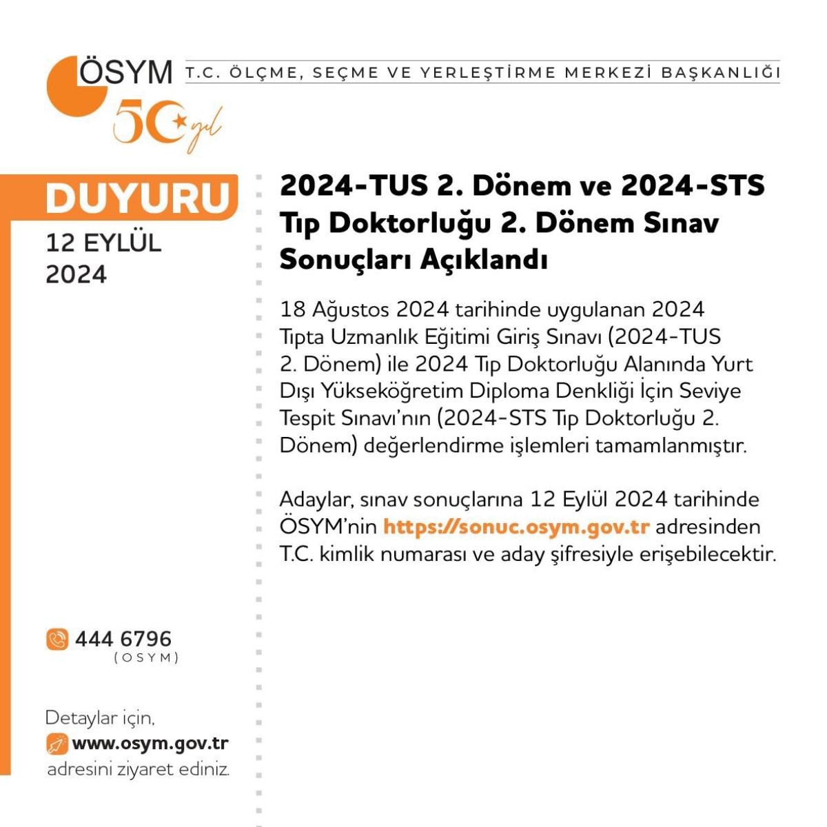 Ölçme, Seçme ve Yerleştirme Merkezi (ÖSYM), 18 Ağustos 2024 tarihinde uygulanan 2024 Tıpta Uzmanlık Eğitimi Giriş Sınavı(2024-TUS) ile 2024 Tıp Doktorluğu Alanında Yurt Dışı Yükseköğretim Diploma Denkliği için Seviye Tespit Sınavı (2024- STSTıp Doktorluğu 2. Dönem) işlemlerinin tamamlandığını duyurdu.