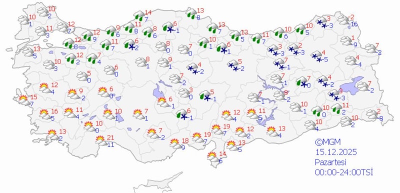 Kar yağışı aynı illerde sürerken, sıcaklıklar batıda 15-2 derece, iç kesimlerde 7-12 derece, doğuda 4-8 derece civarında seyredecek.