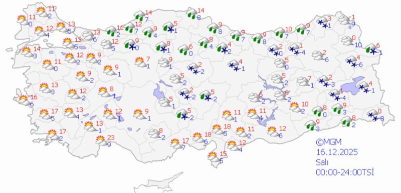 Kuzeydoğu Anadolu ve Doğu Anadolu'da gece sıcaklıkları 0 derece altına inerken, Artvin, Iğdır, Ağrı, Van, Hakkari, Bitlis, Muş, Bayburt, Gümüşhane, Sivas, Kayseri, Niğde, Nevşehir, Yozgat, Tokat, Çankırı, Kastamonu, Bolu, Erzurum, Bingöl, Erzincan illerinde kar yağışı görülecek.