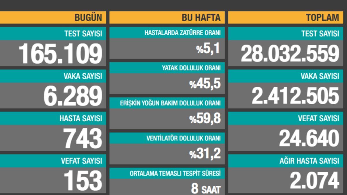 Bugünkü tabloya göre, son 24 saat içerisinde 165 bin 109 kişiye koronavirüs testi yapıldı.