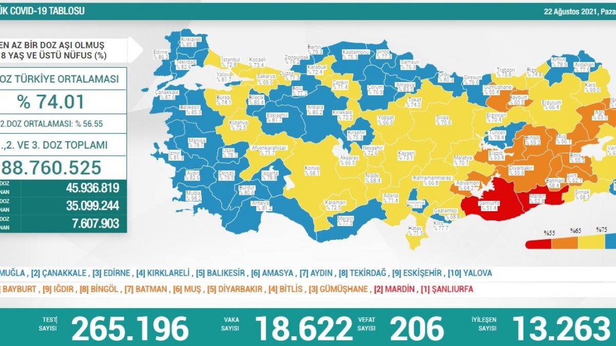 Buna göre; Türkiye'de son 24 saatte 265 bin 196 Kovid-19 testi yapıldı, 18 bin 622 kişinin testi pozitif çıktı, 206 kişi hayatını kaybetti.