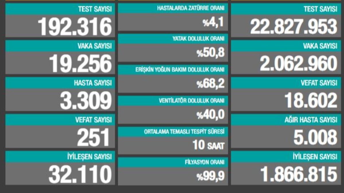 Bugün paylaşılan tabloya göre, yapılan 192 binden fazla test sonucu 19 bin 256 yeni vaka tespit edildi.
