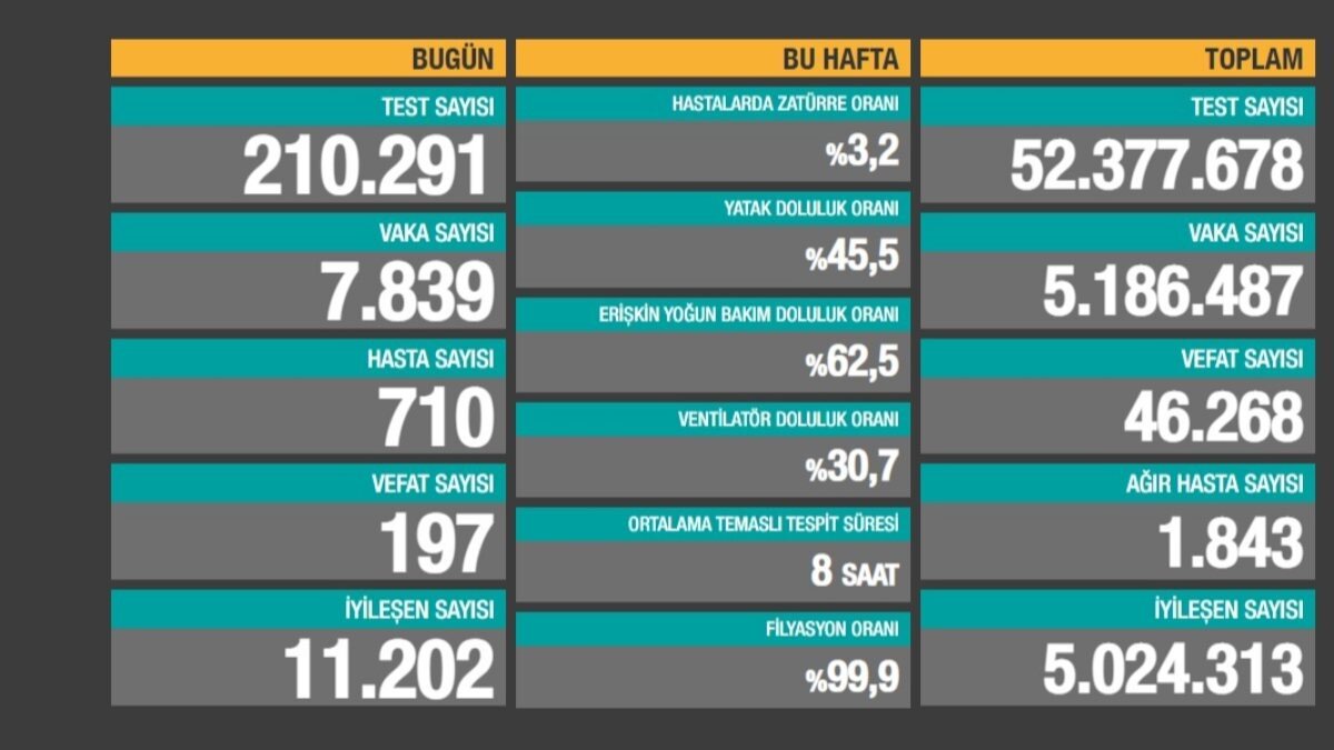 Bakanlığın paylaştığı tabloya göre bugün yapılan testler sonucu 7 bin 839 yeni vaka tespit edildi.