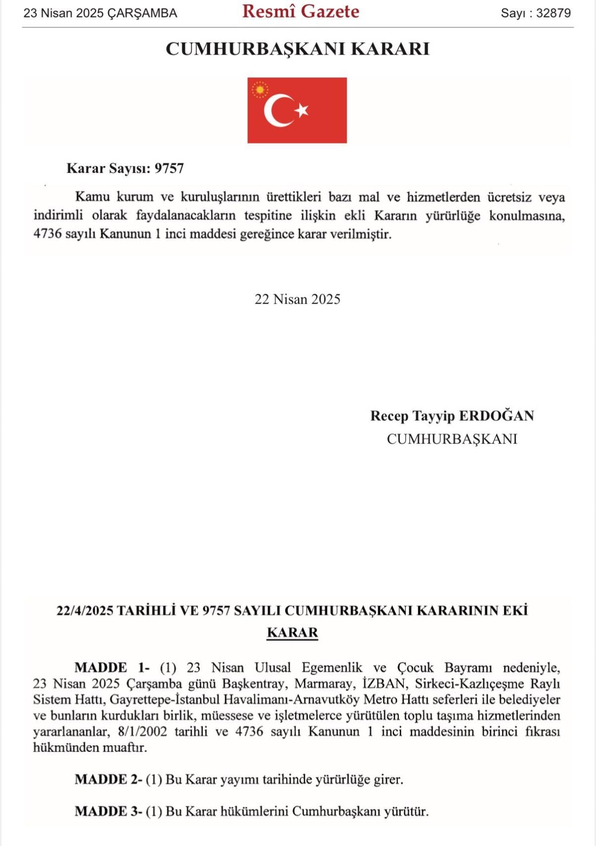Cumhurbaşkanı kararı ile 23 Nisan Ulusal Egemenlik ve Çocuk Bayramı nedeniyle Başkentray, Marmaray, İZBAN, Sirkeci-Kazlıçeşme Raylı Sistem Hattı, Gayrettepe-İstanbul Havalimanı Metro Hattı ile belediyelerin toplu taşıma hizmetleri ücretsiz olacak.