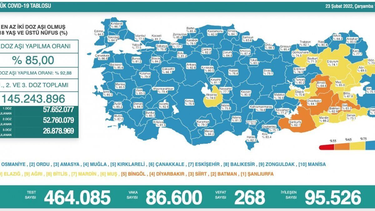 Buna göre; Türkiye'de son 24 saatte 464 bin 85 Kovid-19 testi yapıldı, 86 bin 600 kişinin testi pozitif çıkarken, 268 kişi ise hayatını kaybetti.
