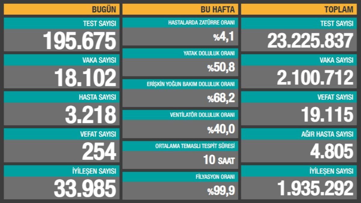 Koca'nın paylaştığı tabloya göre bugün yapılan testler sonucu 18 bin 102 yeni vaka tespit edildi.