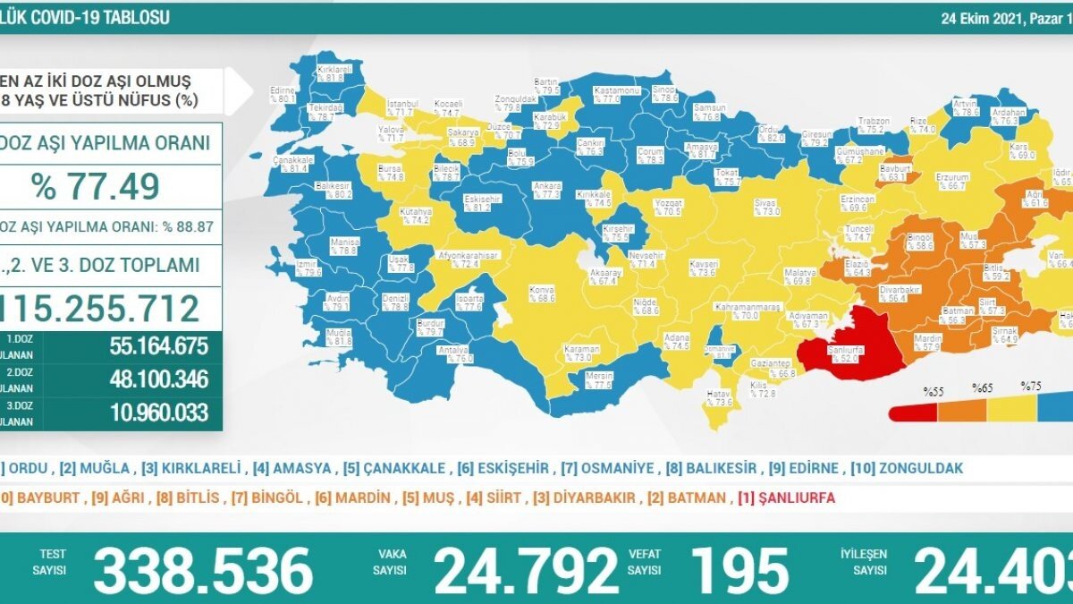 Buna göre; Türkiye'de son 24 saatte 338 bin 536 Kovid-19 testi yapıldı, 24 bin 792 kişinin testi pozitif çıktı, 195 kişi hayatını kaybetti.