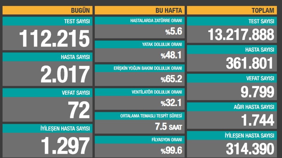 72 kişi virüse yenilerek hayatını kaybederken toplam can kaybı 9 bin 799 oldu.