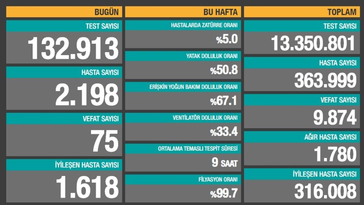 Bakan Koca'nın açıkladığı tabloya göre bugün yapılan testler sonucu 2 bin 198 kişi daha koronavirüse yakalandı.