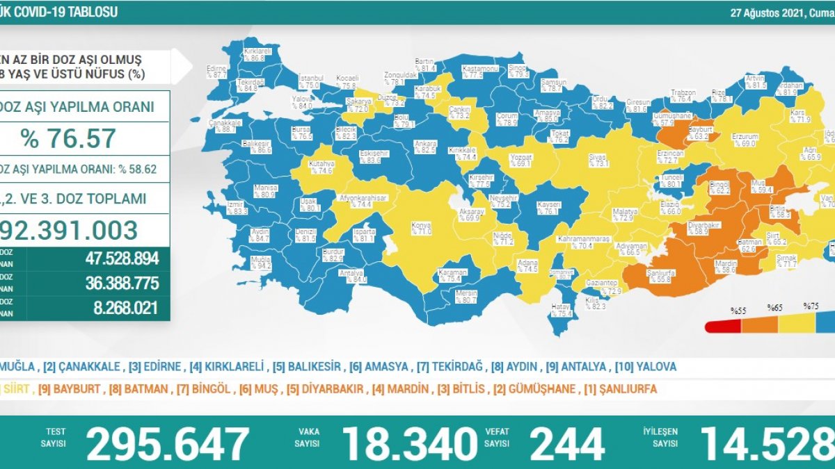 Toplamda uygulanan 1. doz aşı miktarı 47 milyon 528 bin 894, 2. doz uygulanan aşı miktarı 36 milyon 388 bin 775, 3.doz uygulanan aşı miktarı ise 8 milyon 268 bin 21 oldu.