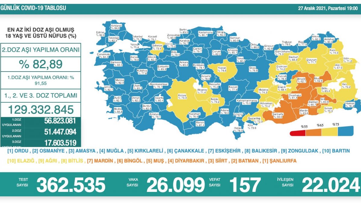 Buna göre; Türkiye'de son 24 saatte 362 bin 535 Kovid-19 testi yapıldı, 26 bin 99 kişinin testi pozitif çıkarken, 157 kişi ise hayatını kaybetti.