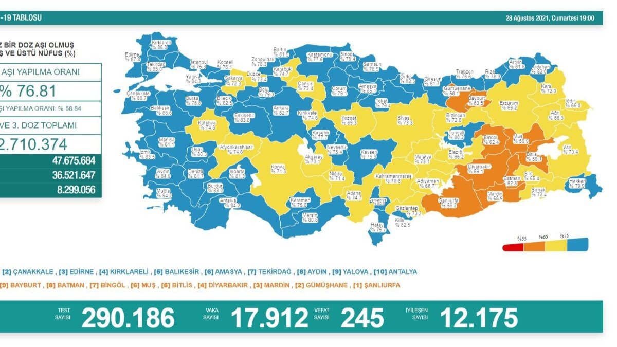 Buna göre; Türkiye'de son 24 saatte 290 bin 186 Kovid-19 testi yapıldı, 17 bin 912 kişinin testi pozitif çıktı, 245 kişi hayatını kaybetti.