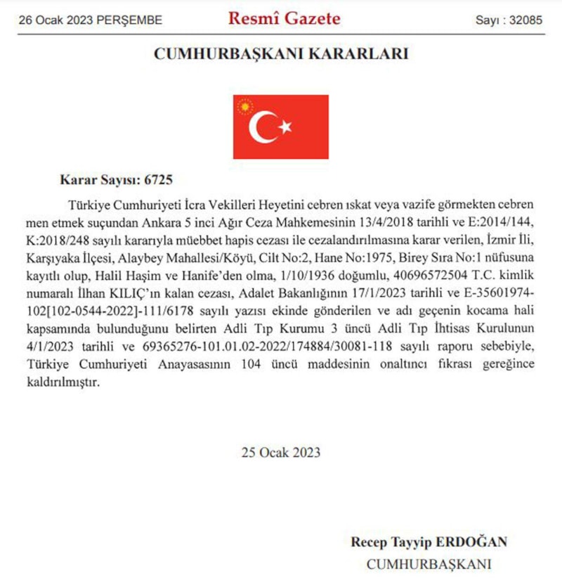 Cumhurbaşkanı Recep Tayyip Erdoğan'ın imzasıyla Resmi Gazete'de yayınlanan karara göre; eski Orgeneral İlhan Kılıç ile eski Tümgeneral Kenan Deniz'in cezaları, sağlık sorunları nedeniyle kaldırıldı.