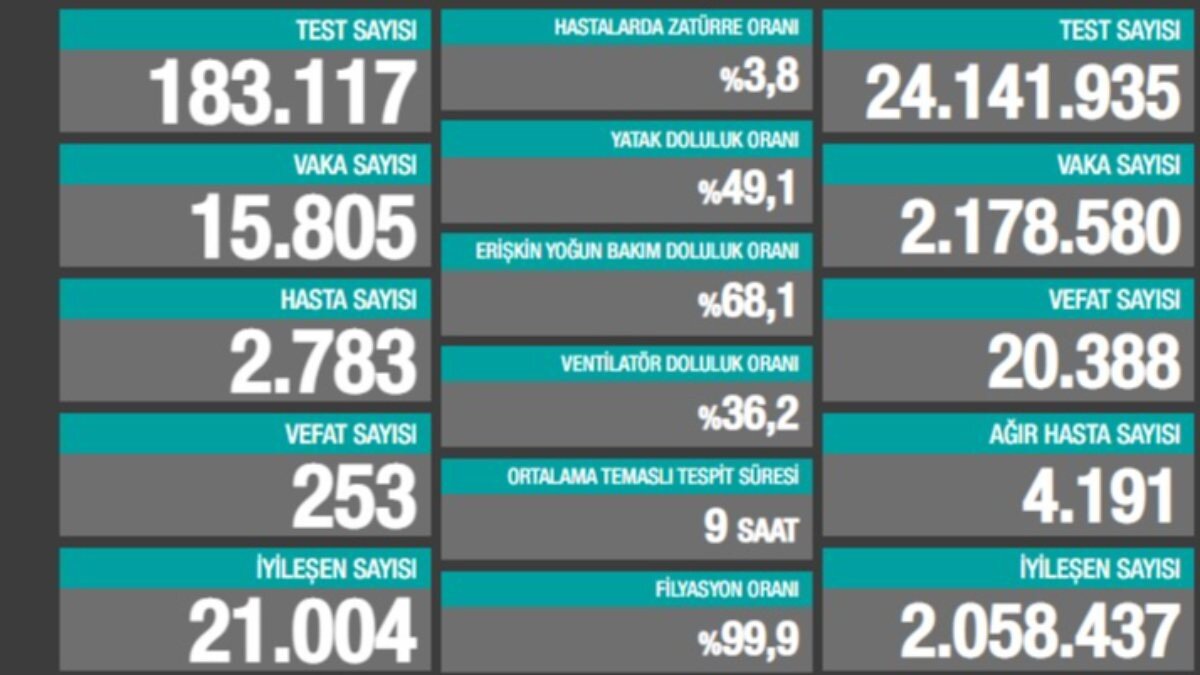 Bugün paylaşılan tabloya göre, yapılan 183 binden fazla test sonucu 15 bin 805 yeni vaka tespit edildi.