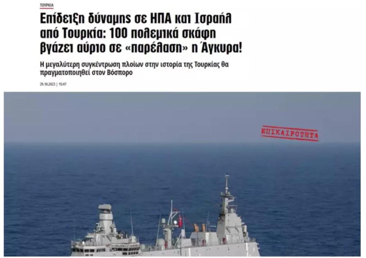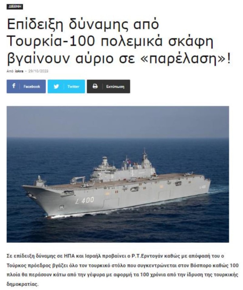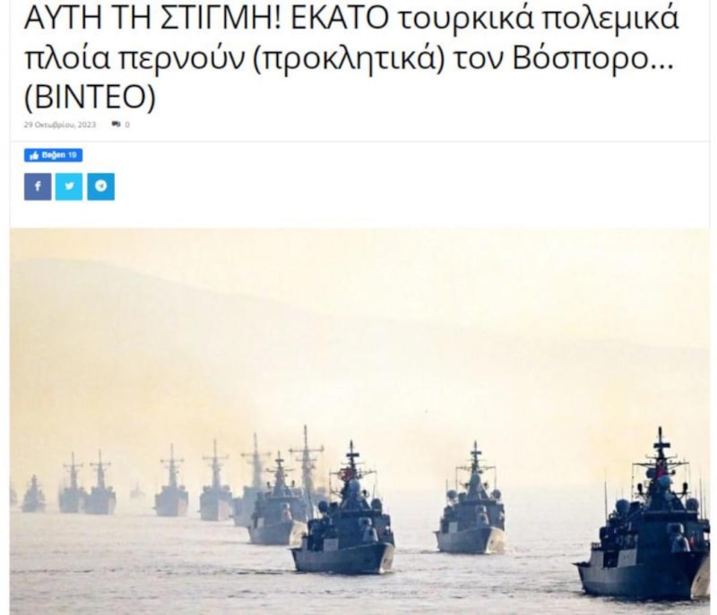 Defancenet sitesinde ise, "Türkiye Cumhuriyeti`nin kuruluşunun 100. yılını kutlamak için 100 gemi köprünün altından geçerken, tüm Türk filosu Erdoğan'ın emriyle güç gösterisi yapmak üzere Boğaz'da toplanıyor." denildi.