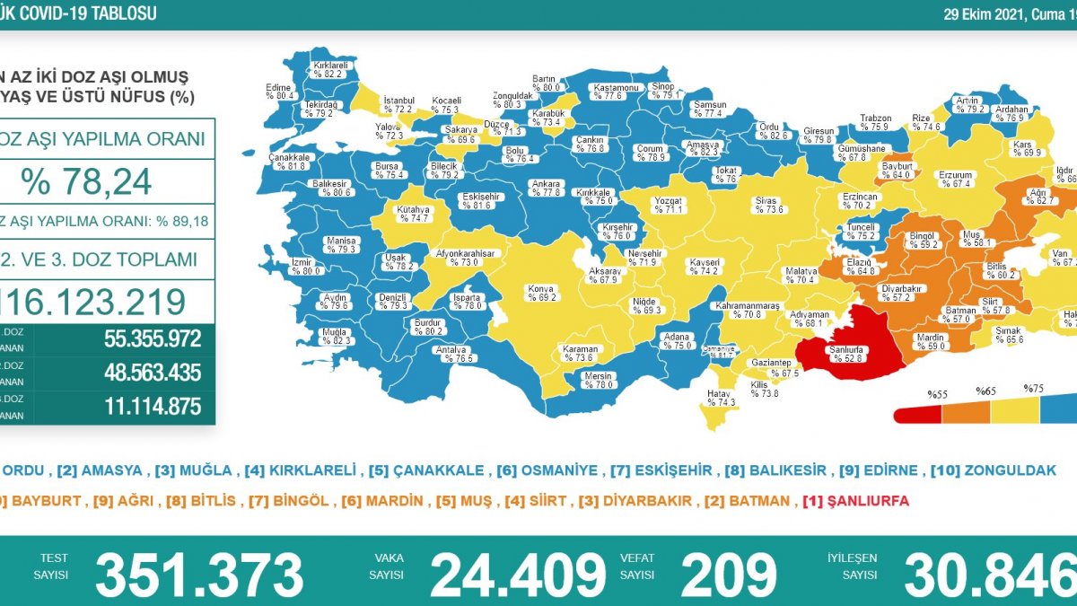 Buna göre; Türkiye'de son 24 saatte 351 bin 373 Kovid-19 testi yapıldı, 24 bin 409 kişinin testi pozitif çıktı, 209 kişi hayatını kaybetti.