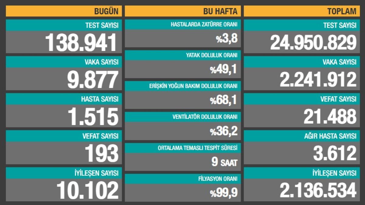 Koca'nın paylaştığı tabloya göre bugün yapılan testler sonucu 9 bin 877 kişinin virüse yakalandığı belirlendi.