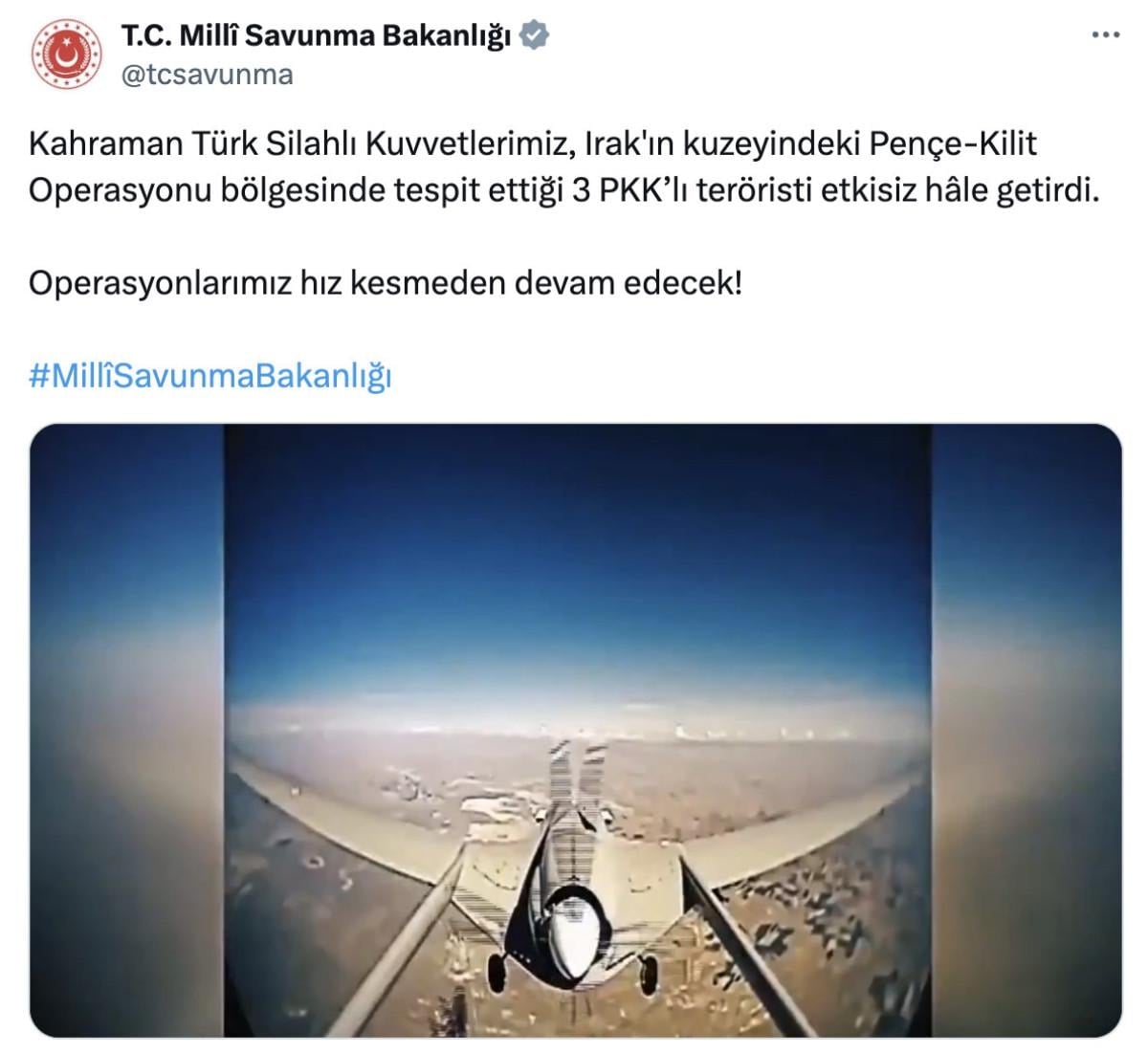 Bu aşamada Milli Savunma Bakanlığı (MSB), Irak'ın kuzeyindeki Pençe-Kilit Operasyonu bölgesinde 3 PKK'lı teröristin etkisiz hale getirildiğini bildirdi.